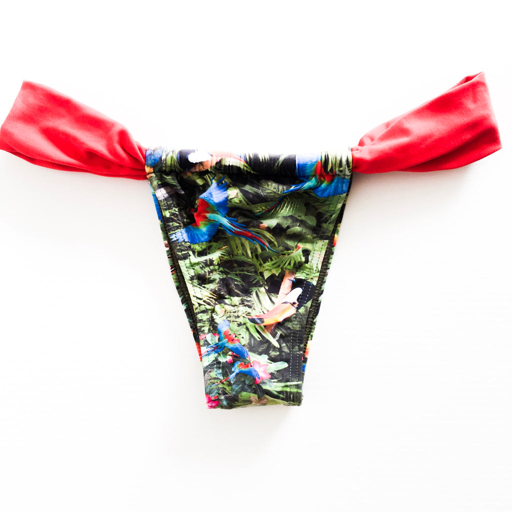 The famous Brazilian bikini bottom, renowned for its cheeky fit enhancing the curves of the body. In a statement print inspired by the Amazon jungle. Featuring a wide band in a variety of vivid colours, this style is ideal for bronzing in the sun on hot summer days.