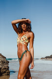The Pineapple print is a must have. In a flattering wrap style with no padding, match it with the Green tie bottoms for a stand out set this summer