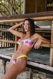 This mesmerizing print is evocative of the colours splashed across the sky as the sun sets on a hot summer night. This padded top offers versatility with its halter or bandeau style finish.